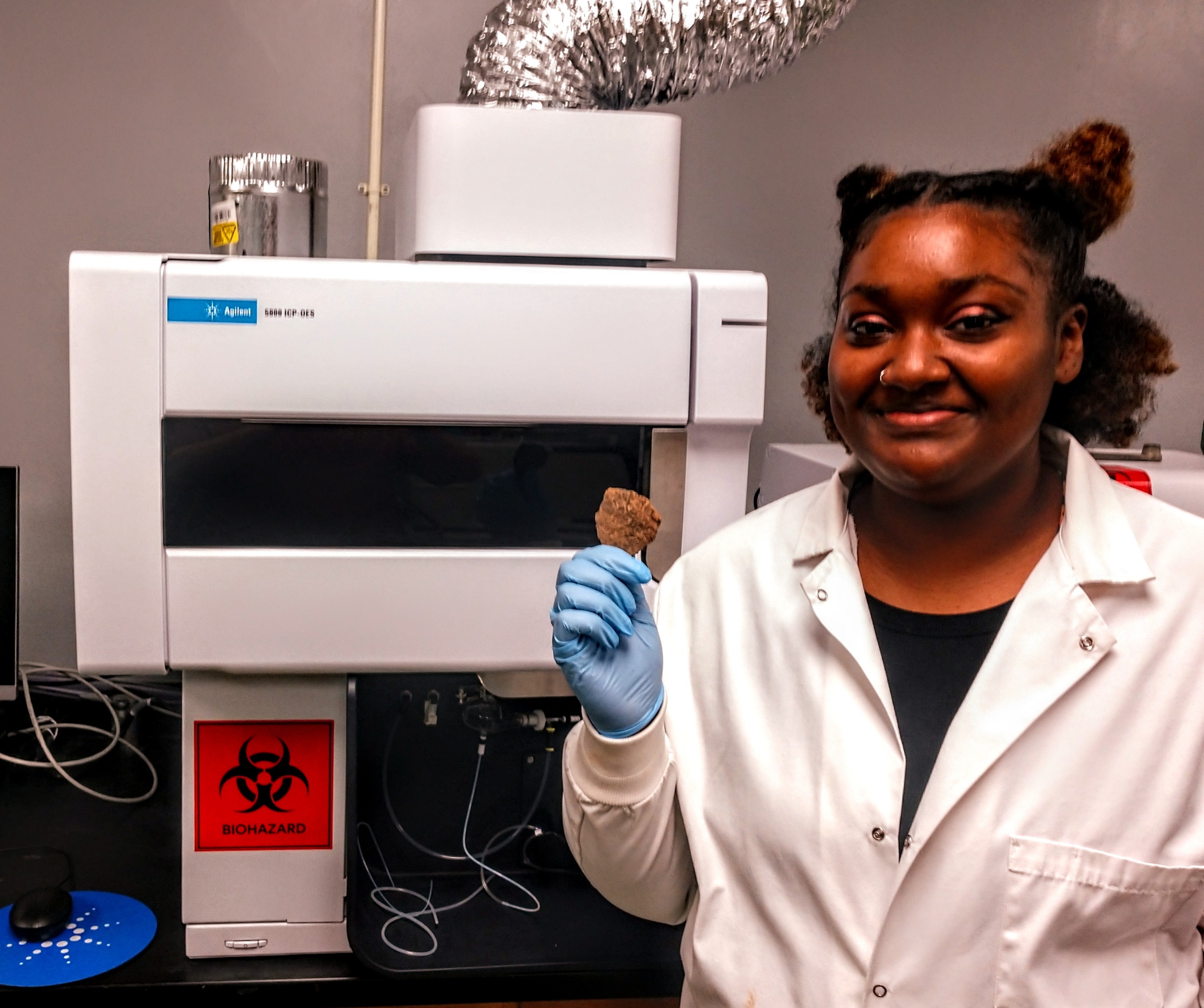 The process for determining the pottery’s content is destructive: students grind up the samples, digest them with acid, filter them, and feed them through the ICP-OES analytical tool. The instrument can detect and measure all the elements of a sample, including carbon, lead, sulfur, calcium, magnesium, and aluminum. MC recently acquired the machine for the Department of Chemistry and Biochemistry.