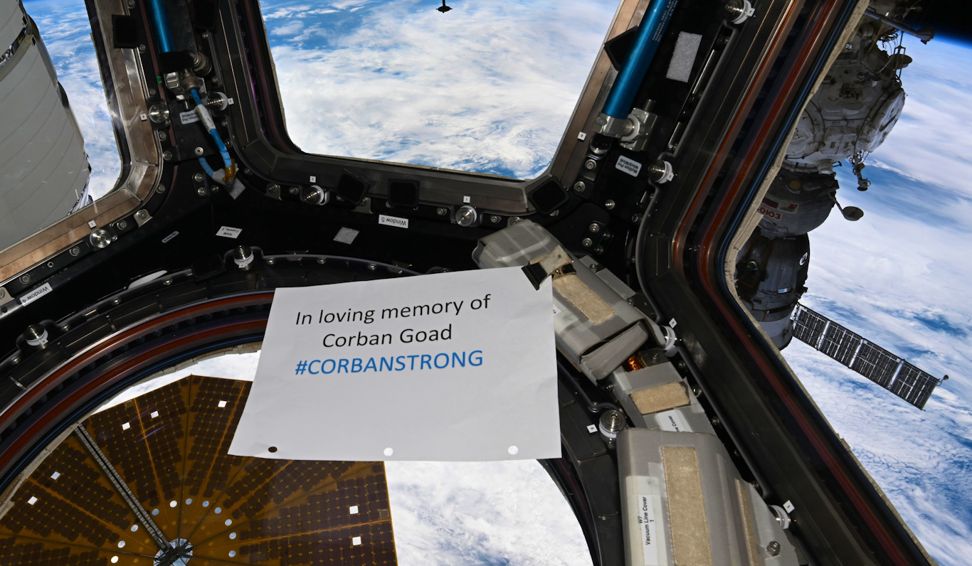 Chester shares that he was not looking forward to his second Father’s Day without his son. “Honestly, I’d thought, ‘Well, I might not even go to church today. I don’t want to hear all the recognitions of the dads – and all that stuff,’ but I woke up that morning and received a text message from a good friend…who happens to be related to an astronaut,” he chuckles. The friend quickly shared a brand-new picture taken by astronaut Barry “Butch” Wilmore, who was based at the International Space Station. The photo showed a note that read “In loving memory of Corban Goad #CORBANSTRONG,” with the blue curvature of the earth visible miles below.