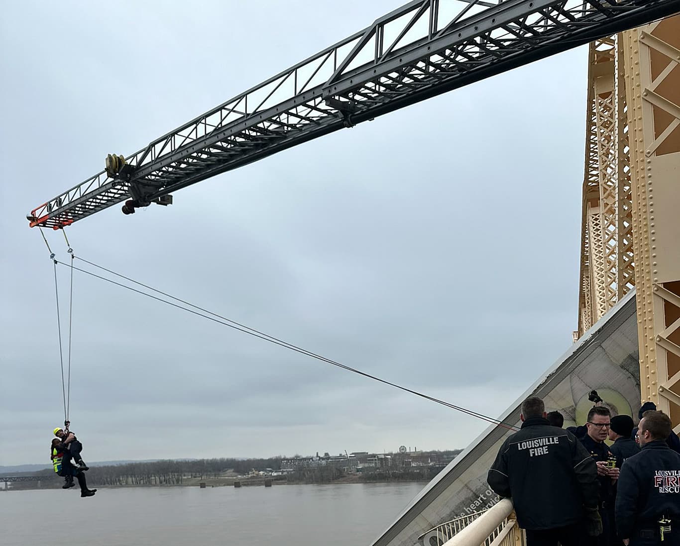 A fire-rescue team considered options and set up a crane to lower a rescuer, who then helped the driver out of the cab - and both were slowly raised to safety on the Clark Memorial Bridge.
