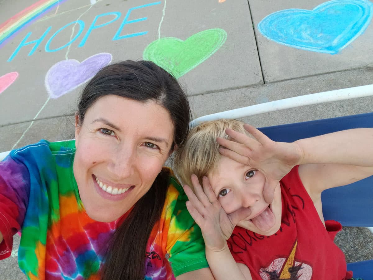 Maybelle, with son Jesse pictured above, tells us: "We took a break outside and decided to shine some of God's light, show a little love to our neighbors by drawing a rainbow and write encouraging words. My son wanted to include Jesus in our message."