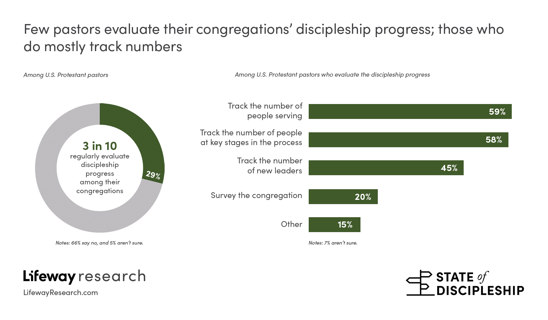 Among those who evaluate the discipleship progress, most say, as part of that, they track the number of people serving (59%) and the number of people at key stages in the process (58%). Slightly less than half (45%) track the number of new leaders. One in 5 (20%) survey the congregation, while 15% say they do something else and 7% aren’t sure.