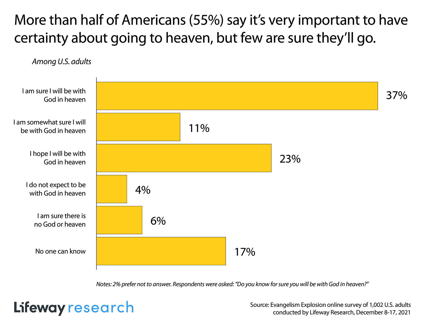 Despite how important most Americans say eternal life is, few say they have such certainty. Slightly more than a third (37%) say they are sure they will be with God in heaven. Another 11% say they are somewhat sure, while 23% say they hope they’ll be in heaven. Few (4%) don’t expect to make it, and 6% are sure there is no God or heaven. According to 17% of Americans, no one can know if they’ll go to heaven.