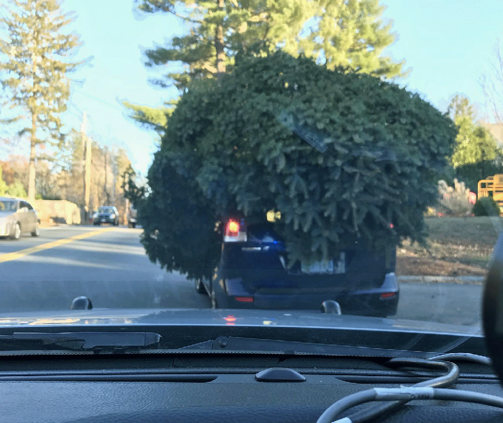 Image above: "Sudbury PD would like to remind you to transport your Holiday trees responsibly. One of our Officer's stopped this vehicle on Route 20 today!" (2017)