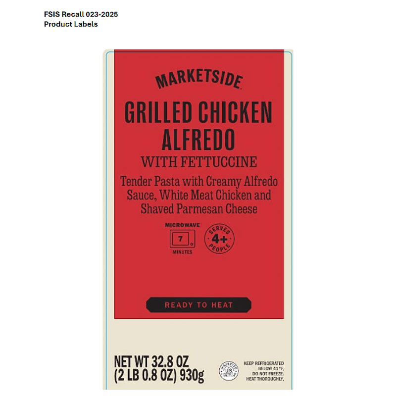 — 32.8-ounce trays of Marketside Grilled Chicken Alfredo with Fettucine Tender Pasta with Creamy Alfredo Sauce, White Meat Chicken and Shaved Parmesan Cheese with best-by dates of June 27 or earlier.