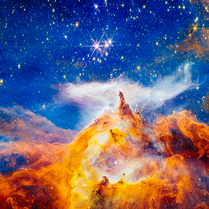 Besides baby stars in a variety of sizes and colors, the photo reveals a dramatic cloud of star-forming dust and gas. This cloud — the so-called Lobster Nebula — is so massive that it spills beyond the camera lens. The cluster of infant stars, named Pismis 24, is located deep inside.