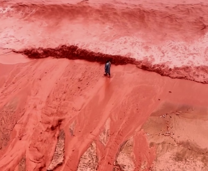 TEHRAN, Iran (AP) — Rainfall on Iran's Hormuz Island briefly transformed the coastline of its famed Red Beach into a striking natural scene this week, as red soil flowed into the sea and turned the water shades of deep red.