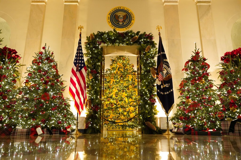 Volunteers from around the country helped decorate the executive mansion after Thanksgiving with 62 Christmas trees, 106 Christmas wreaths, more than 1,200 feet of garland, more than 3,200 strands of lights and 17,000 bows. The White House led the news media on a tour of the decor on Monday before a reception for the volunteers.