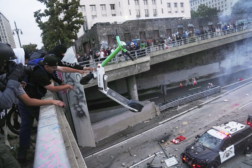 [Photo Credit: AP Photo/Ethan Swope] Protesters throw objects at police vehicles on a Freeway near the Metropolitan Detention Center in downtown Los Angeles