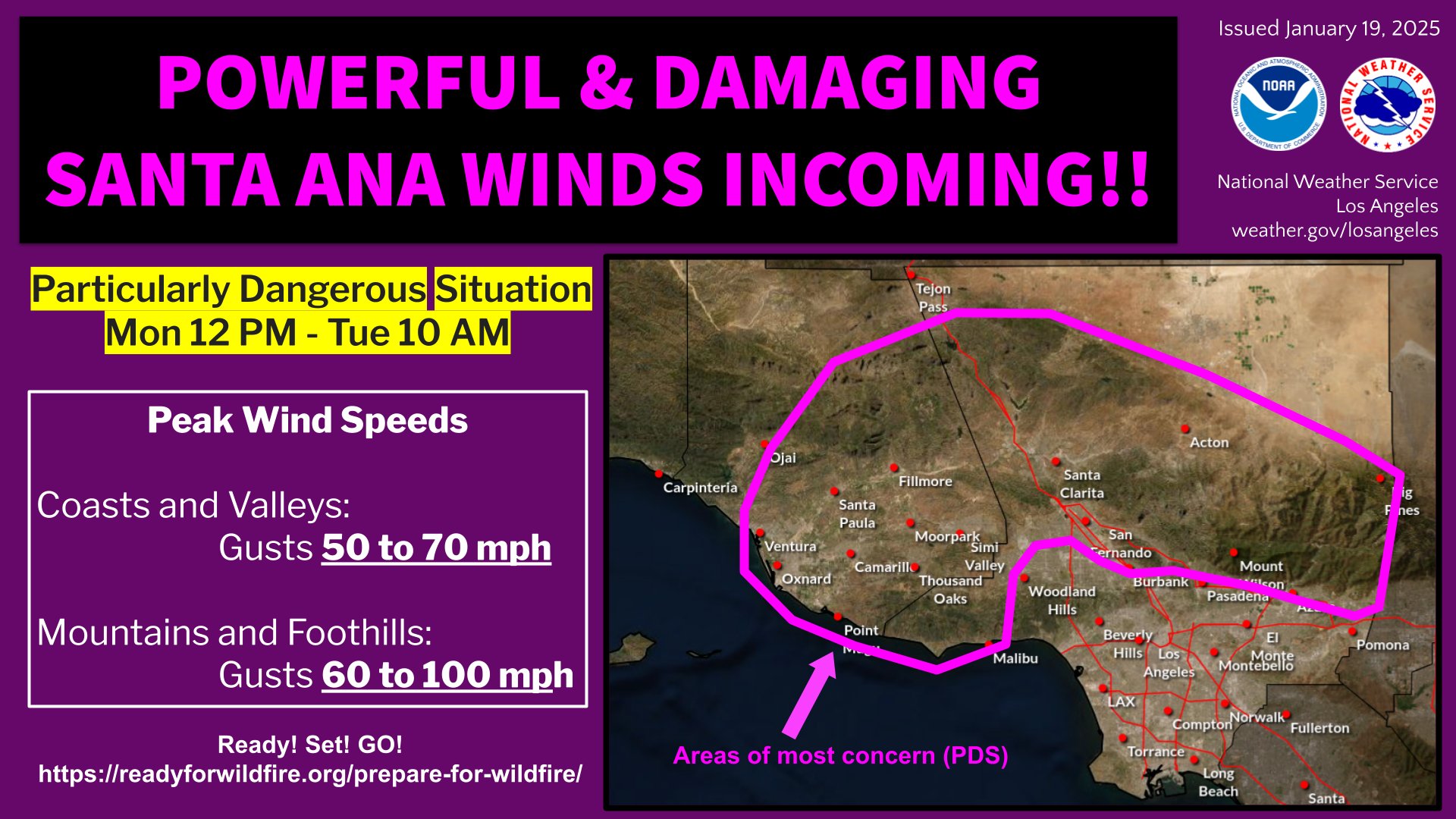 POWERFUL & DAMAGING SANTA ANA WINDSTORM INCOMING!! Take action now to prepare your home and loved ones for another round of EXTREME WIND and FIRE WEATHER, staring tomorrow afternoon! Worst winds Mon afternoon - Tue morning. #CAwx #SantaAnaWinds   - NWS Los Angeles