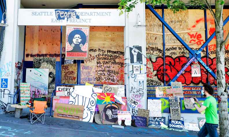 Protesters cordoned off the several-block area near the police's East Precinct after Seattle riot squads unleashed tear gas, pepper spray and flash-bangs on large crowds of mostly peaceful protesters, drawing condemnation from many city leaders and a federal court order temporarily banning the use of the weapons on demonstrators.