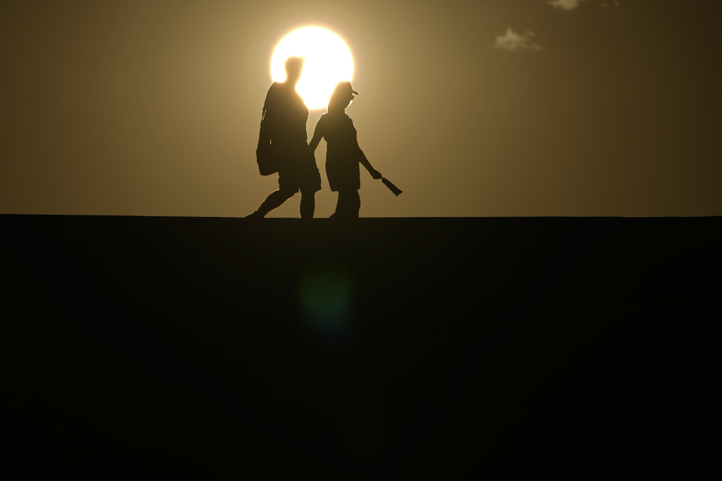 A few miles away at Badwater Basin — the lowest point in North America at 282 feet (85.95 meters) below sea level — tourists took selfies and briefly walked along the white salt flats ringed by sandy-colored mountains as wisps of clouds crawled overhead. Meteorologists say that thin cloud cover most likely kept temperatures from reaching potential record highs.