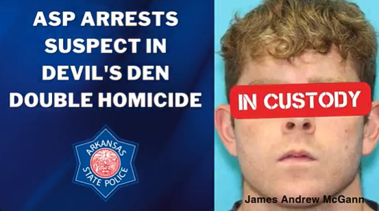 State Police arrested Andrew James McGann at a barbershop in Springdale, said Col. Stacie Rhoads, commander of the department's criminal investigation division. He was charged with two counts of capital murder and was being held Thursday in the state's Washington County jail.