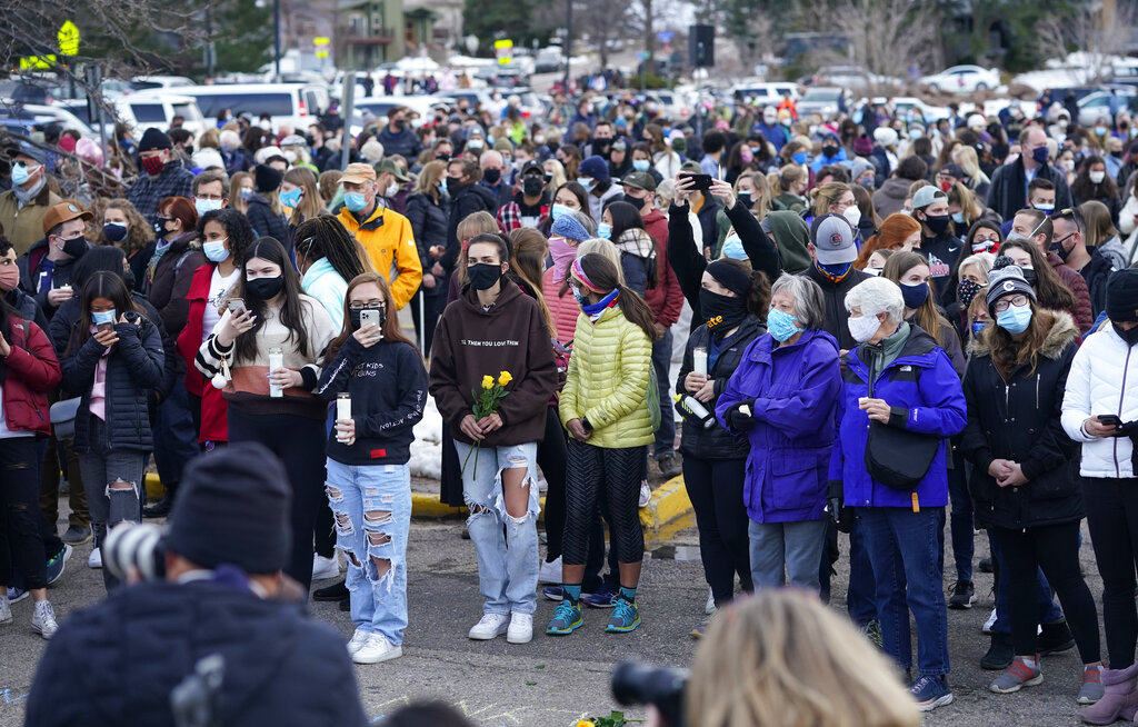BOULDER, Colo. (AP) — About 2,000 people gathered for a vigil honoring the 10 people who died in the Colorado supermarket shooting Thursday night after attorneys for the shooting suspect asked during his first court appearance that he receive a mental health evaluation before the case against him proceeds.