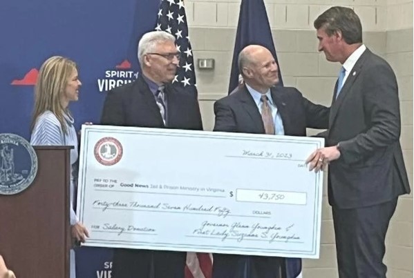 In making the donation, Youngkin and his wife affirmed their support of the Good News chaplains' work in Virginia jails and prisons and the importance of giving people a second chance.