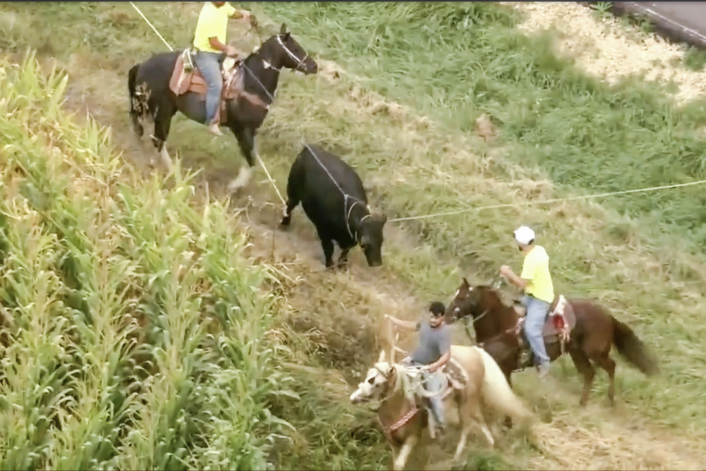 Video from WLS-TV shows six men on horseback chasing the 1,200-pound (544-kilogram) black angus crossbreed through a pasture after it had broken free from one lasso around its neck. Three of the men on horseback then successfully lassoed the bull on the edge of a cornfield just outside the town of Union.