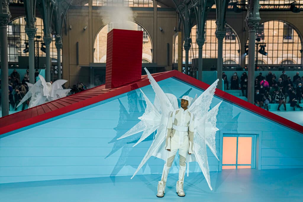 The stage of a bedroom, staircase, trampoline and smoking chimney on the central Paris runway conjured up nostalgic images evoking Abloh’s childhood, dovetailing with themes that defined his Louis Vuitton aesthetic since 2018.