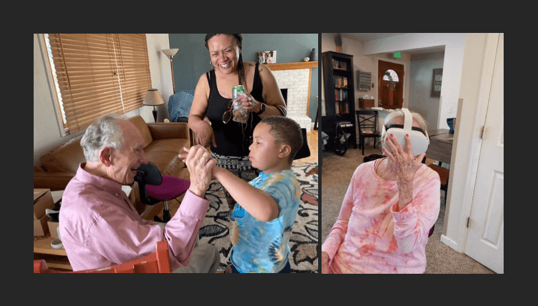 Clarence ‘Robbie’ Robinson, a senior center volunteer at age 87, recently brought VR headsets to Thrive Care Homes in Littleton, Colorado. Aviant Healthcare had been given the headsets through a program that helped seniors who could not travel during the pandemic due to health concerns. Robbie credits Aviant’s Barbara Lotze will giving him the encouragement to give VR headsets a try on his visits.